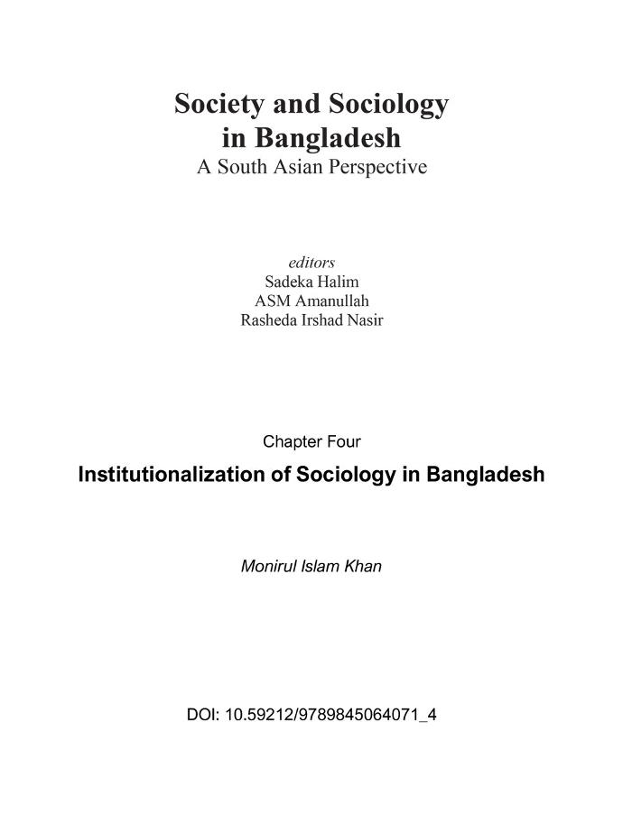 Khan, Monirul Islam, AU.  Institutionalization of Sociology in Bangladesh. Society and Sociology in Bangladesh:  A South Asian Perspective. Dhaka, Bangladesh. https://dx.doi.org/10.59212/9789845064071_4